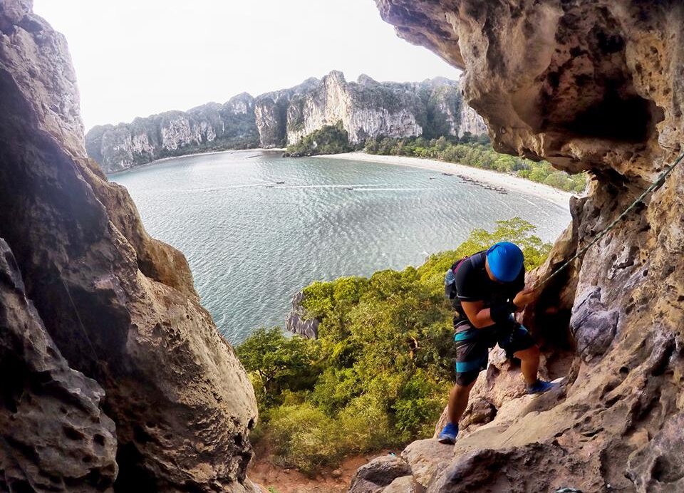 ช่วงบ่าย เรานั่งเรือไปที่หาดไร่เลย์ ไปยังร้านที่ให้บริการปีนหน้าผา เจ๊เจ้าของร้านถามพวกเราก่อนเลยว่า “มีใครไม่อยากปีนไหมคะ” พวกเราได้แต่ยืน งงๆ ยิ้มๆ เจ๊เลยสรุปว่า “โอเค อยากทุกคนนะคะ” จากนั้นเจ๊ก็จัดแจงอุปกรณ์ให้พวกเรา